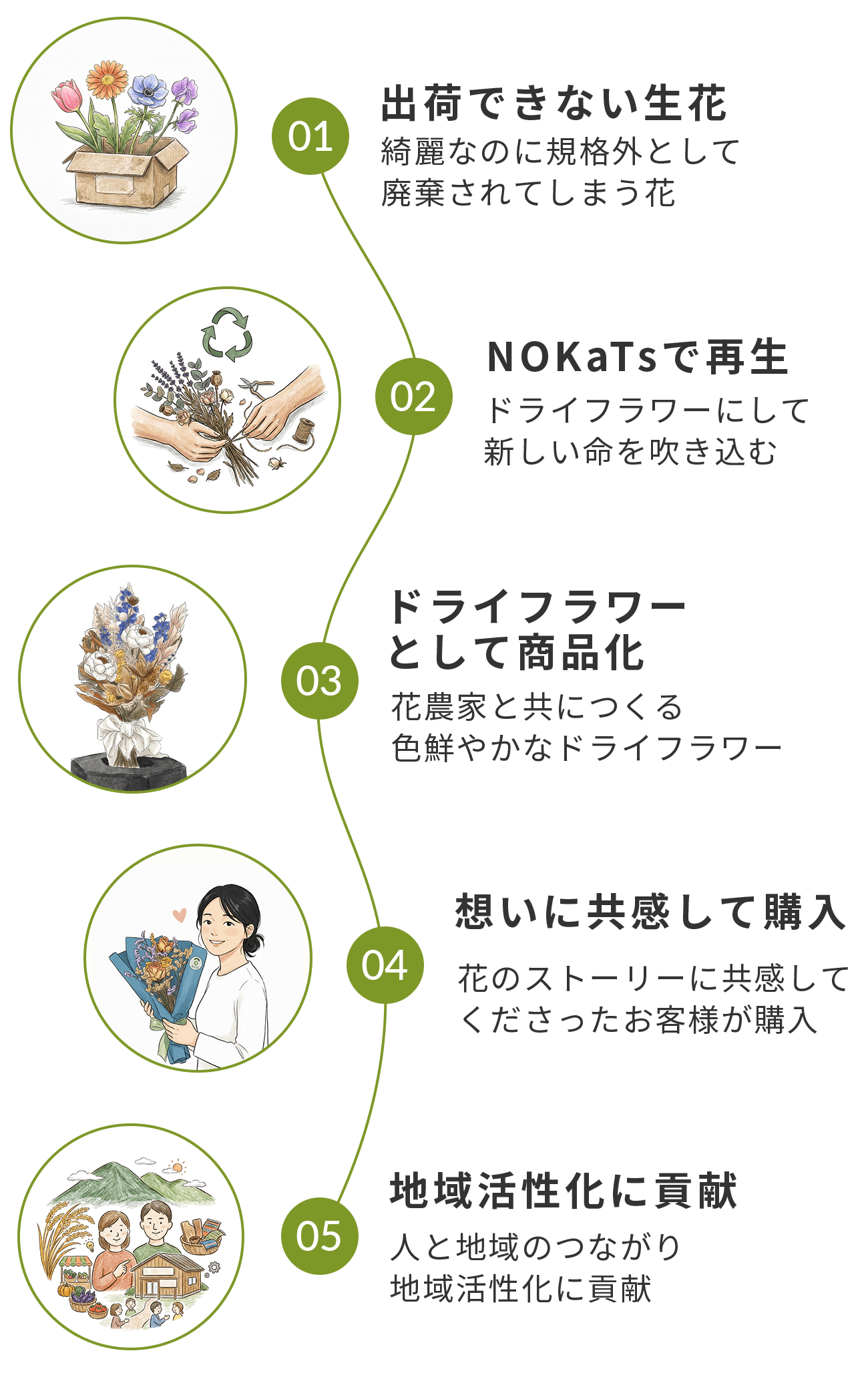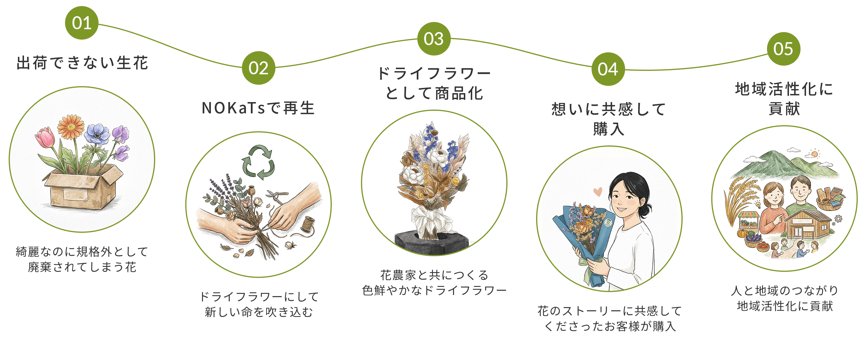 NOKaTs(のおかつ)は、生花の生産が盛んな熊本県の阿蘇高森町のじり地区というところで 規格外の花を活用した『阿蘇ドライフラワー』を生産しながら、 地域おこしの活動を行っている団体です。